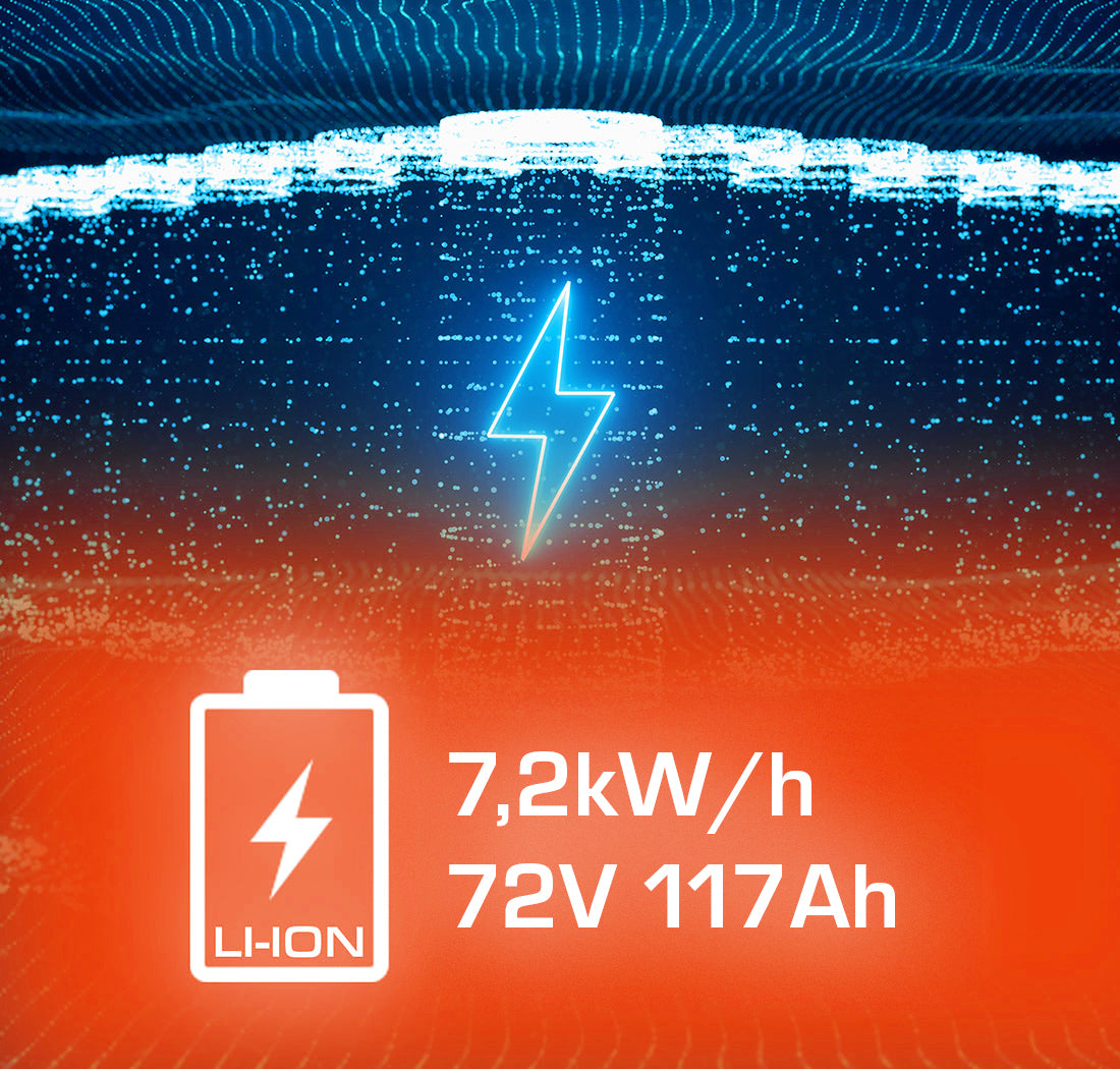 – 72V 117Ah statt 100Ah für noch mehr Reichweite und längere Fahrzeiten pro Ladung.